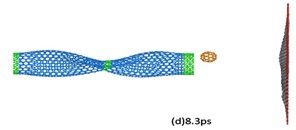 | Via molecular dynamics simulations, employing aforementioned mechanism, we presented a conceptual design of nanoballista based on CNTs which contained a fullerene. As shown in Figure 1(a), a small portion of a (5, 5) carbon nanotube was previously twisted though rotating atoms fixed in region L1 and L2 (colored in green), and then optimized to obtain reasonable geometrics. The nozzle of the tube (colored in green) was also fixed to avoid the energy dissipation and maintain the stabilization of motion direction of the C60. Then, the restrains on the atoms in region L2 were removed. For the fact that the torsional strain energy were concentrated in the left section of tube, the stress gradient along the longitude direction started a stress wave which boosted the C60, as depicted in Figure 1(b) and (c). As can be seen in Figure 2, the muzzle velocity of C60 could be up to 4 km/s (about twelve times of sound velocity). The graphene sheet was introduced as a bulletproof membrane to stop bullet from passing through it. The graphene sheet absorbed collision energy by bending and emitted a transverse deflection wave propagating in the sp2 bond network. It should be noted that the instantaneous impact pressure of the contact region was calculated to be in the range of 1-10 GPa (see Figure 3). Finally, the fullerene was rebounded by the graphene sheet. Furthermore, the relationship between temperature and impact pressure was investigated. |